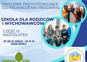 Zapraszamy do udziału w szkoleniu przygotowującym do prowadzenia zajęć w ramach III części Programu „Szkoła dla rodziców i wychowawców”. Po ukończeniu szkolenia będziecie Państwo posiadać uprawnienia i kompetencje do prowadzenia spotkań dla rodziców i wychowawców nastolatków uwzględniających problemy wieku dorastania,